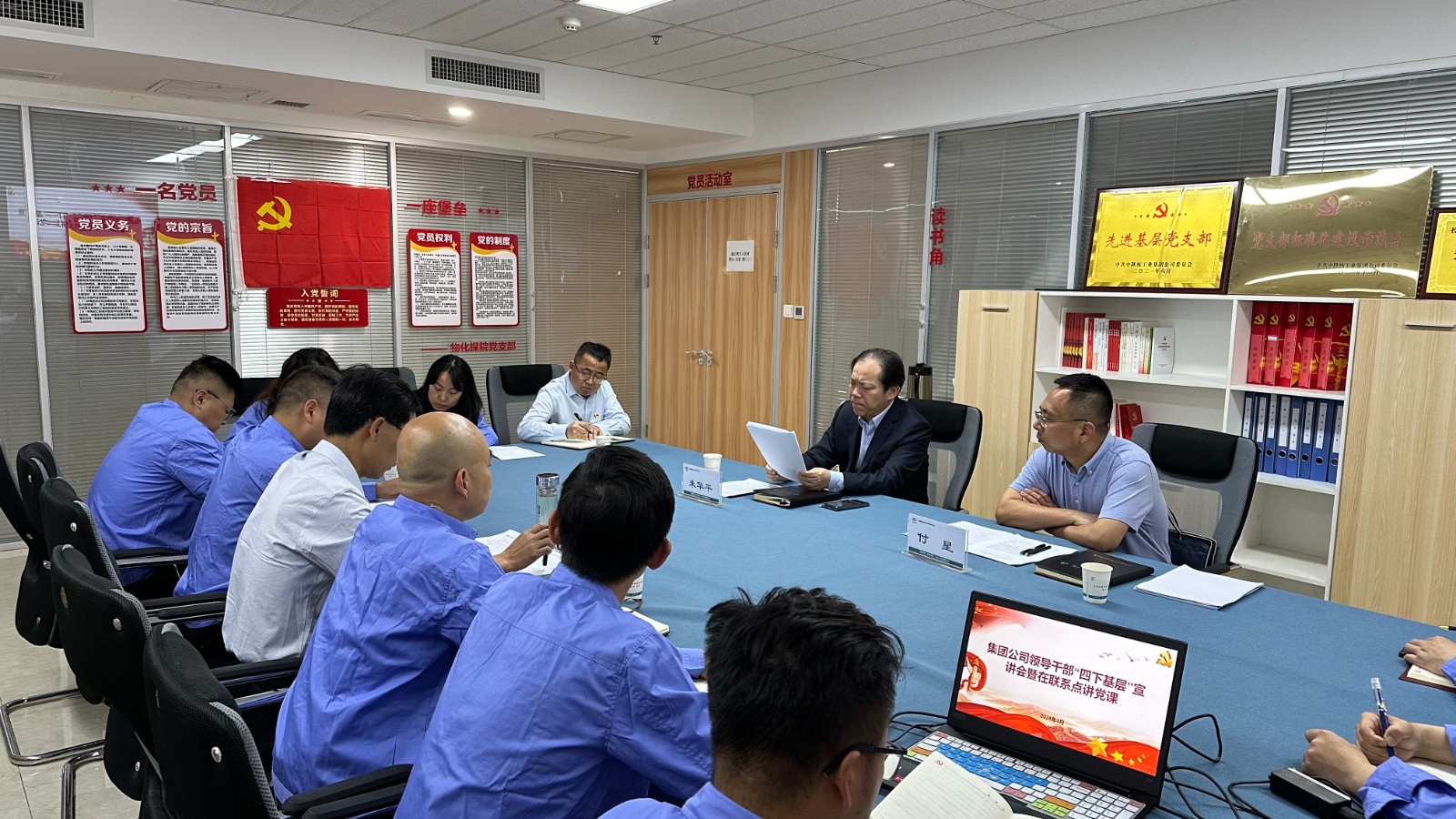 集團公司辦公室主任付星,公司黨委書記、董事長鄧盛波、紀委書記楊昭、副總經理冉軍林、黨群工作部部長馮永強及物化探院全體黨員等20人參加了會議。