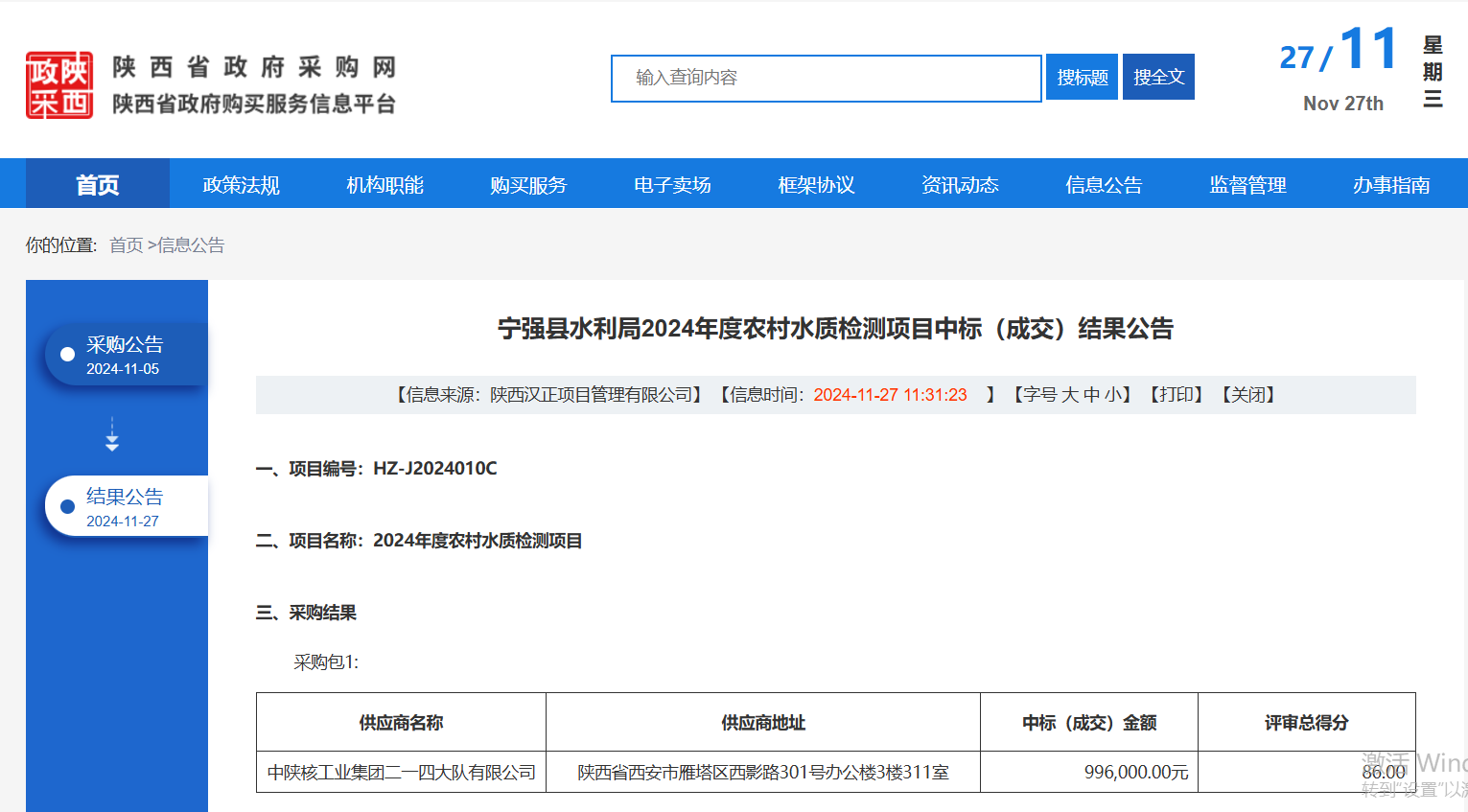 11月27日,公司物化探院成功中標(biāo)寧強(qiáng)縣水利局2024年度農(nóng)村水質(zhì)檢測(cè)項(xiàng)目第一標(biāo)段,中標(biāo)金額99.6萬(wàn)元整。
