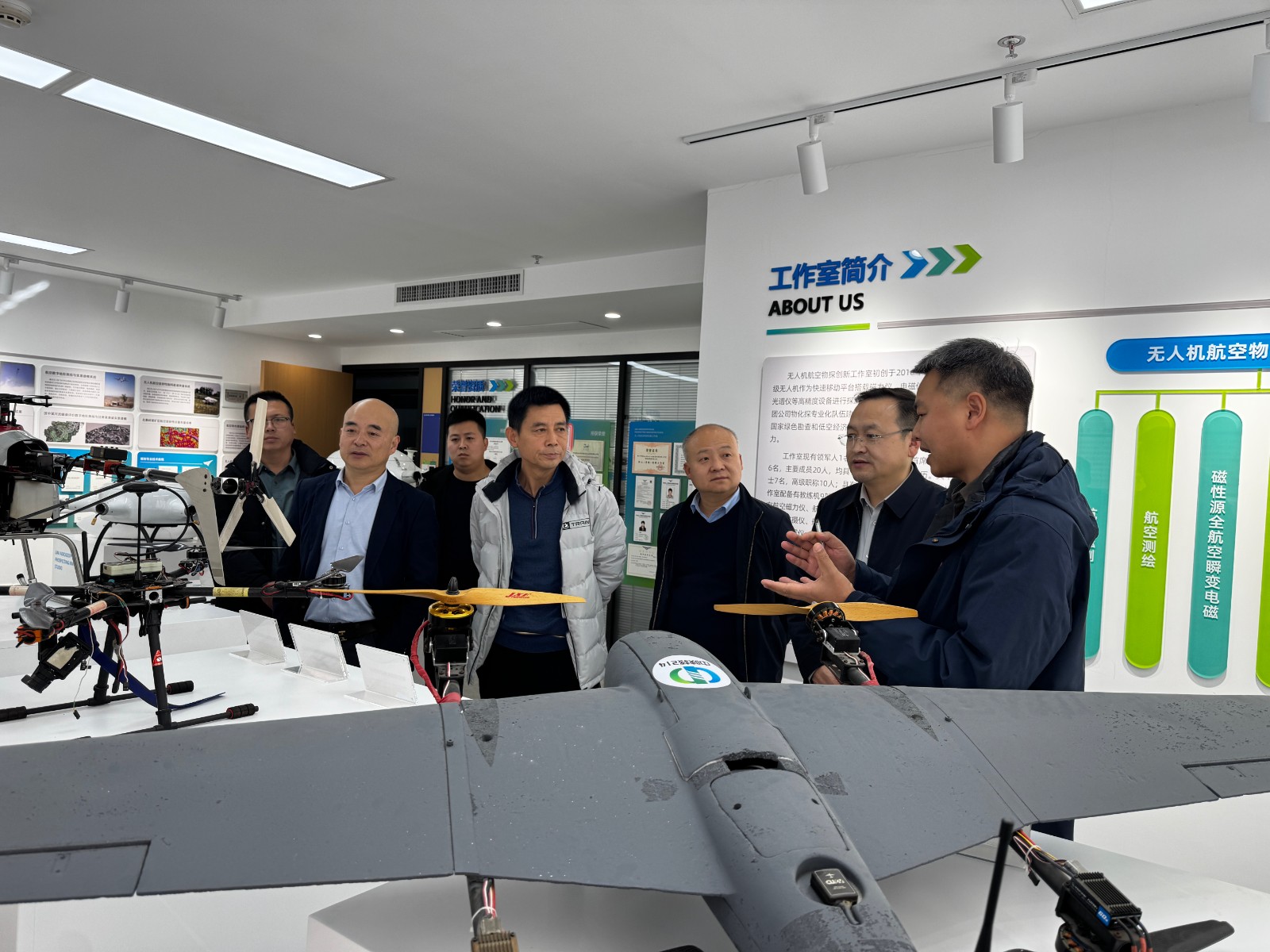 會前,王文飛一行實(shí)地參觀了二一四隊(duì)航空物探創(chuàng)新工作室展廳,詳細(xì)了解二一四隊(duì)在航空物探領(lǐng)域的技術(shù)積累、設(shè)備研發(fā)及成果轉(zhuǎn)化應(yīng)用成效,對其在物探技術(shù)創(chuàng)新方面的前瞻性探索與實(shí)踐成果給予高度認(rèn)可。