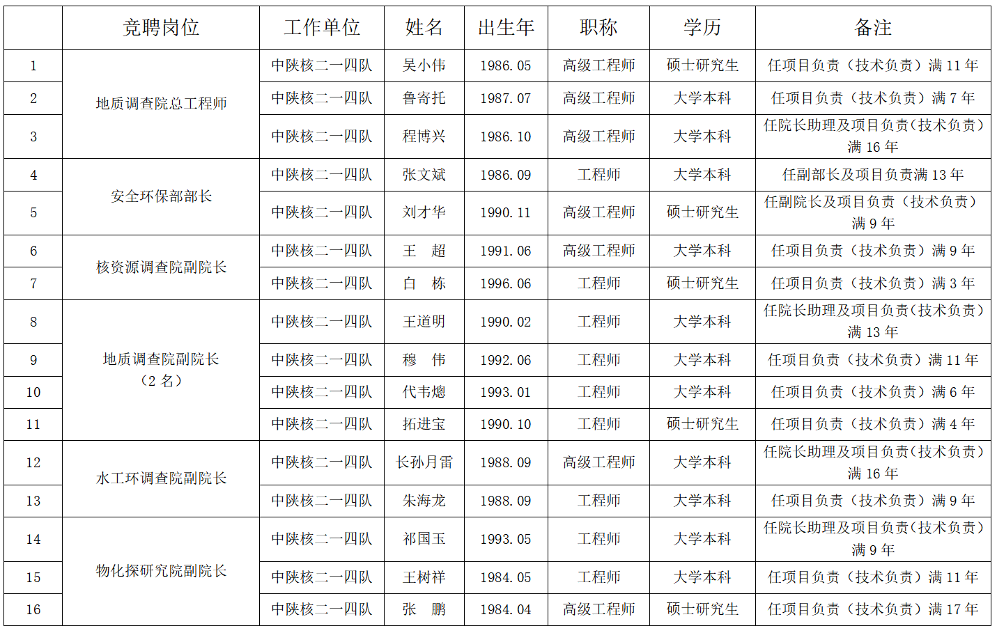 根據(jù)《中陜核工業(yè)集團(tuán)二一四大隊有限公司關(guān)于公開競聘中層管理崗位的實施方案》有關(guān)要求,現(xiàn)對資格審查通過的報名人員予以公示: