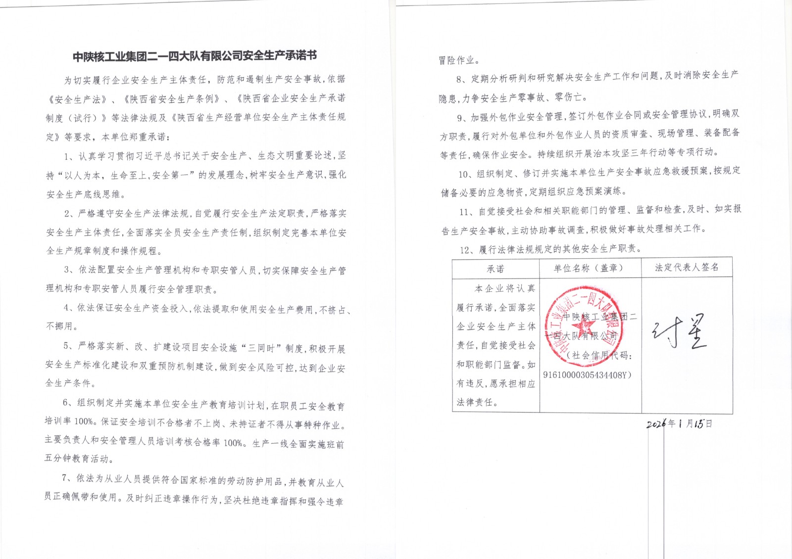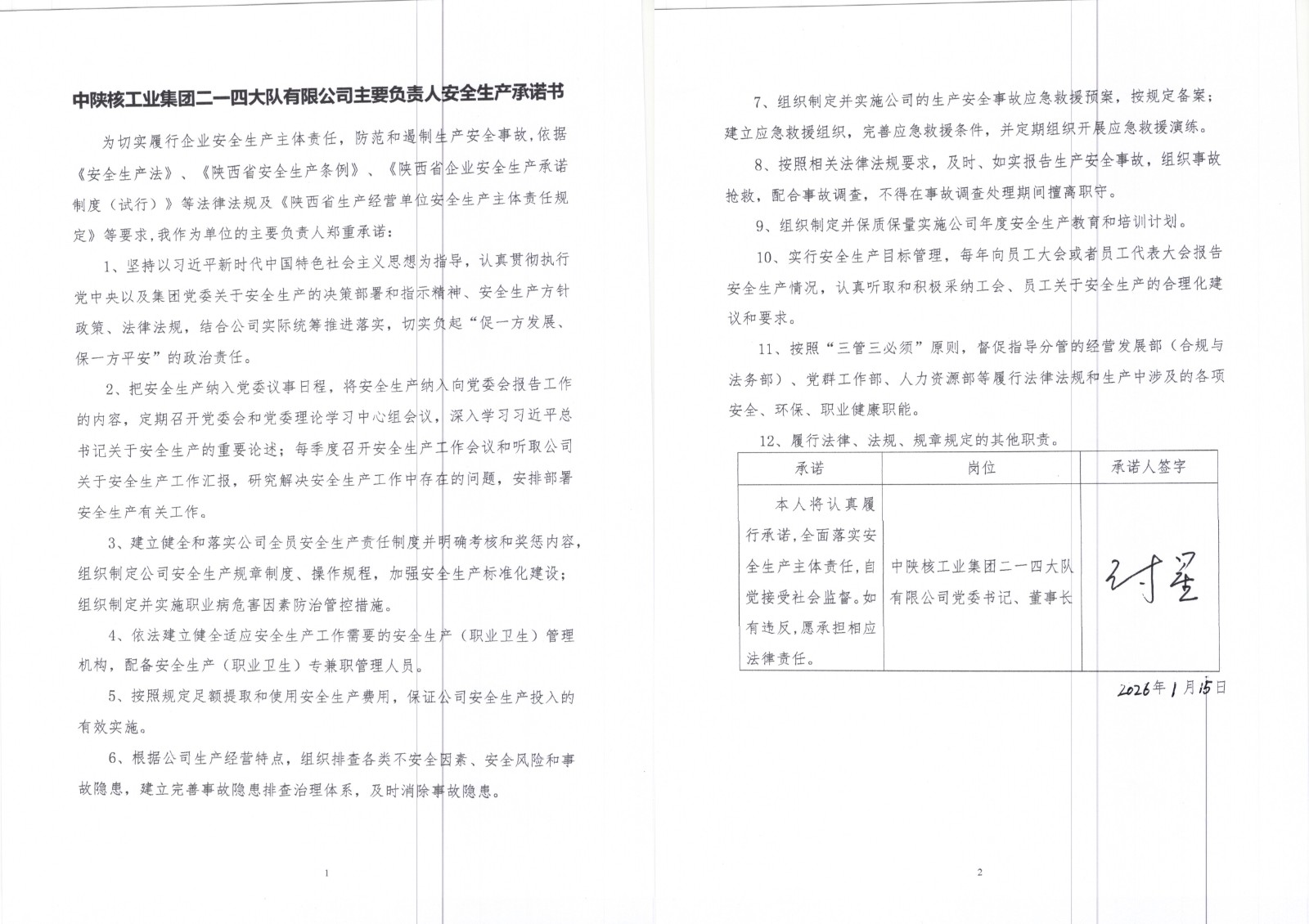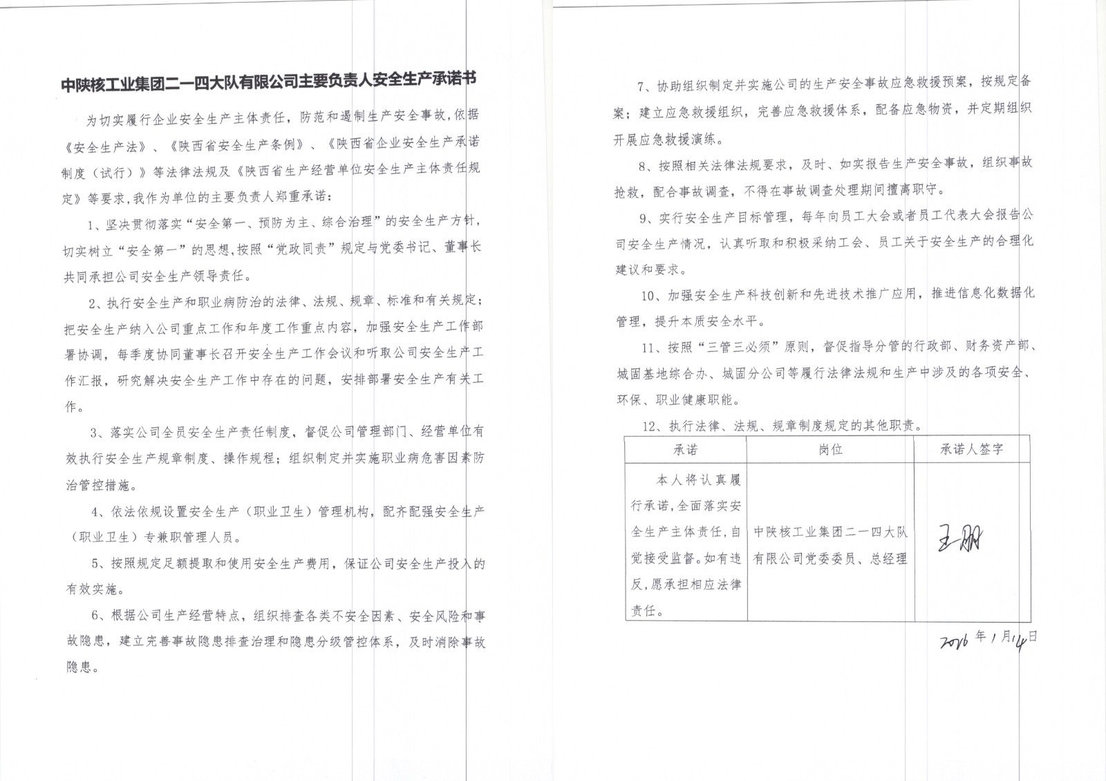 中陜核工業集團二一四大隊有限公司安全生產承諾書