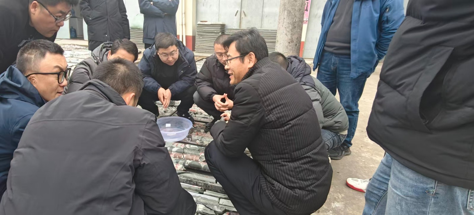 郭科鋒一行首先聽取了項(xiàng)目負(fù)責(zé)人關(guān)于西鄉(xiāng)縣蔡家梁金礦詳查項(xiàng)目整體開展情況、關(guān)鍵節(jié)點(diǎn)實(shí)施進(jìn)度及階段性找礦成果的系統(tǒng)匯報(bào),隨后細(xì)致檢查了探礦工程原始編錄資料和巖心,對(duì)于項(xiàng)目組工作成績(jī)給予了充分肯定。同時(shí)針對(duì)項(xiàng)目后續(xù)推進(jìn),提出了明確要求:一是深化地質(zhì)綜合研究,通過多維度對(duì)比佐證已有勘查成果,精準(zhǔn)總結(jié)成礦富集規(guī)律,為深部找礦提供科學(xué)理論支撐;二是聚焦“明金效應(yīng)”找礦難題,加快開展專題研究,進(jìn)一步理清找礦思路與方向,為項(xiàng)目全面轉(zhuǎn)入詳查階段筑牢堅(jiān)實(shí)基礎(chǔ);三是強(qiáng)化協(xié)同聯(lián)動(dòng),凝聚集團(tuán)與各級(jí)單位合力,精準(zhǔn)破解項(xiàng)目推進(jìn)中的疑點(diǎn)、難點(diǎn),為找礦突破注入強(qiáng)勁動(dòng)力。最后,郭科鋒重點(diǎn)強(qiáng)調(diào),安全生產(chǎn)是項(xiàng)目發(fā)展的生命線,必須堅(jiān)守安全生產(chǎn)底線,切實(shí)抓好鉆機(jī)冬季施工安全管理、消防安全防控等關(guān)鍵環(huán)節(jié),提前統(tǒng)籌部署野外隊(duì)伍收隊(duì)安排、資料整理等工作,確保項(xiàng)目推進(jìn)安全有序、成果扎實(shí)可靠。