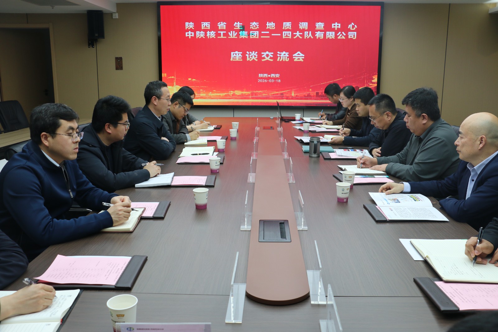 3月18日下午,陜西省生態(tài)地質(zhì)調(diào)查中心與中陜核工業(yè)集團二一四大隊有限公司開展專題調(diào)研座談會,聚焦生態(tài)地質(zhì)技術(shù)創(chuàng)新、項目協(xié)同推進、成果轉(zhuǎn)化應(yīng)用等重點議題深入交流。省生態(tài)地質(zhì)調(diào)查中心黨總支書記、主任薛旭平,總工程師何元方;二一四隊黨委書記、董事長付星,黨委委員、總經(jīng)理王朋參加會議。