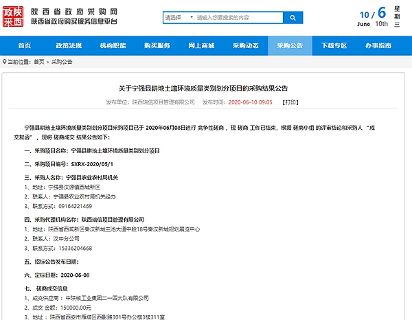 6月10日,在陜西省政府采購網獲悉,公司成功中標“寧強縣耕地土壤環境質量類別劃分項目”。