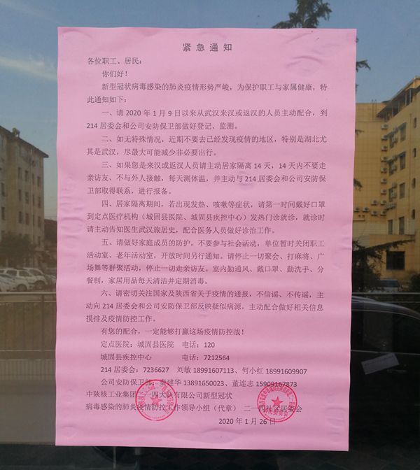 1月30日,中陜核工業(yè)集團(tuán)二一四大隊(duì)有限公司新型冠狀病毒感染的肺炎疫情防控工作領(lǐng)導(dǎo)小組在城固基地組織召開了疫情防控工作領(lǐng)導(dǎo)小組會議,與二一四社區(qū)居委會、陜健醫(yī)二一四醫(yī)院三方共同對當(dāng)前防疫工作進(jìn)行了再安排再部署。