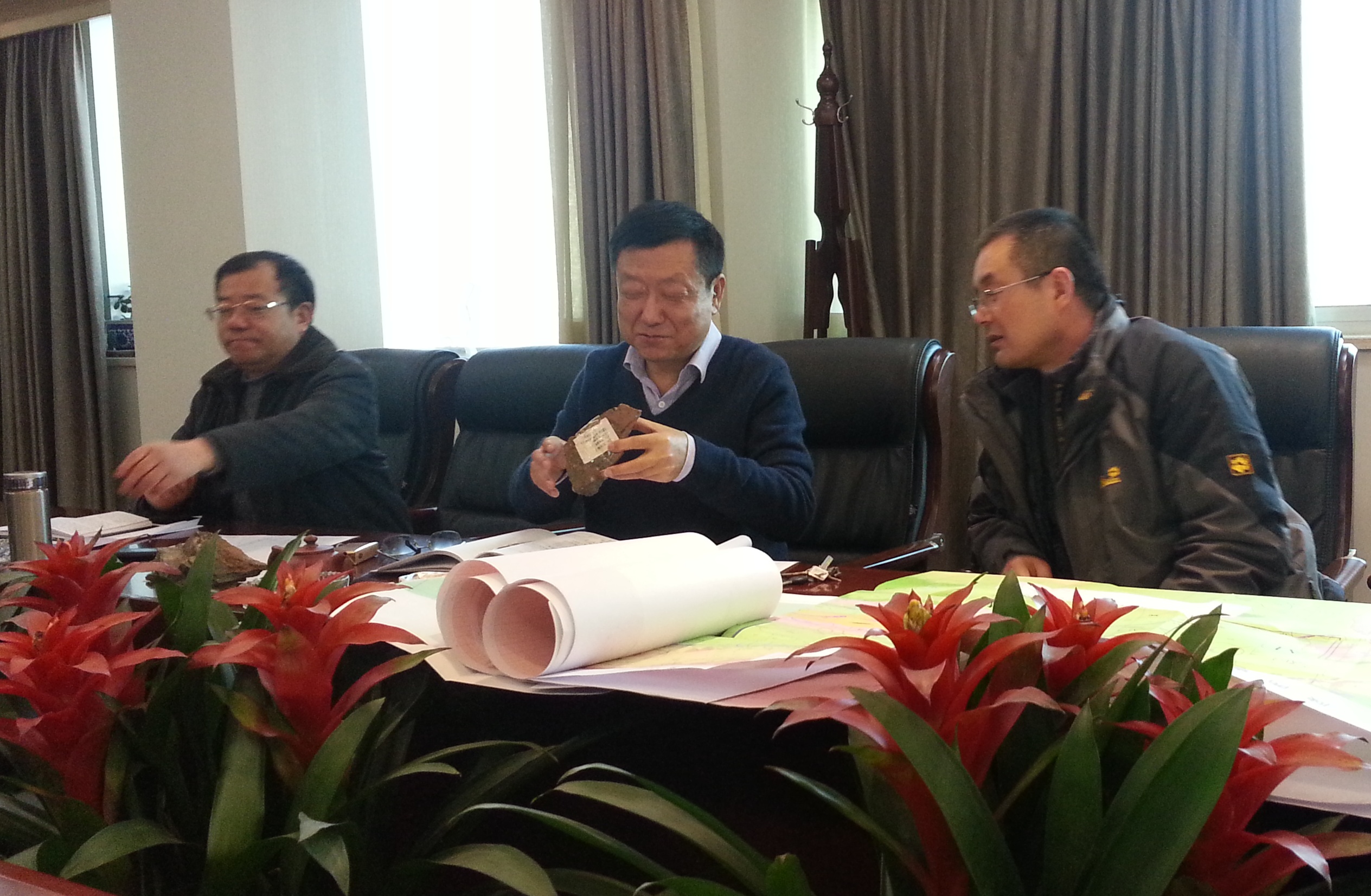 茍副廳長在聽完匯報后仔細查看礦石標本和地質資料,與專家進行了充分研討。他對214在該區的重大發現表示祝賀,贊揚了214地質工作者在野外找礦中敢于創新,挑戰自我的精神品質,并代表廳對大家的辛勤勞動表示感謝。他最后就該區下一步工作進行指導并提出具體要求。他認為該區成礦環境好,目前發現的礦體品位高,規模大,找礦前景好,就該區冬季施工有關工作進行指導,繼續堅持冬季不停工,結合物探手段,加快地表工程控制節奏,快速擴大成果,明年要作為重點項目重點投入開展續作勘查,力爭更大的突破。