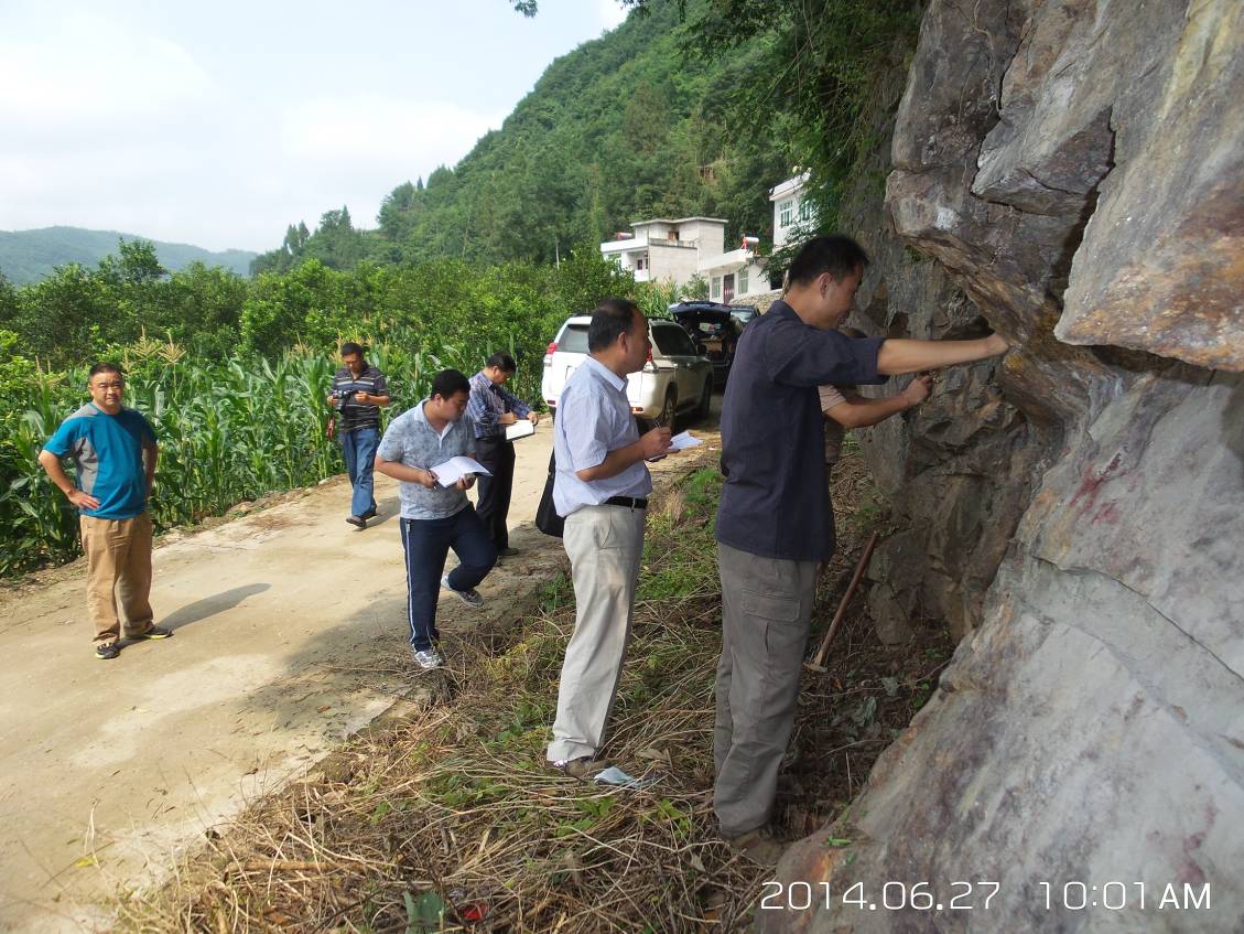 2014年6月26-27日,省基金辦專家張銀龍、張啟、王善勛、李耕(中陜核集團(tuán)副總工程師)、宋工(安康市國(guó)土局工程師)一行,在214大隊(duì)副大隊(duì)長(zhǎng)金衛(wèi)平、214大隊(duì)副總工程師兼地調(diào)院院長(zhǎng)王義忠陪同下,對(duì)214大隊(duì)地調(diào)院承擔(dān)的“陜西省紫陽(yáng)縣漢王城地區(qū)金多金屬礦普查” 項(xiàng)目進(jìn)行了野外驗(yàn)收。